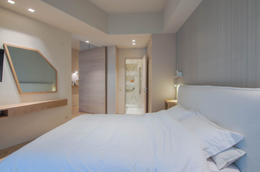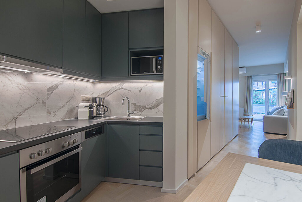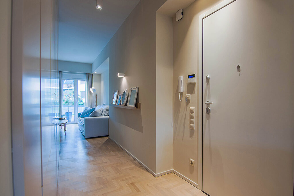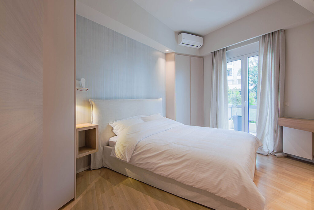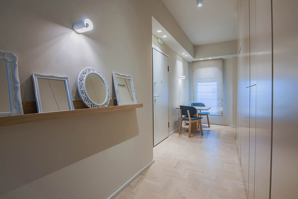 Overlooking a small green park, a state-of-the-art apartment that redefines the standard for excellence in Kolonaki. A big wooden oak art door, being the centrepiece of this residence, disconnects with charm the living room from its ensuite bedroom. A bedroom that gets complete with its long dresser table and a well-hidden beige tone marble bathroom.