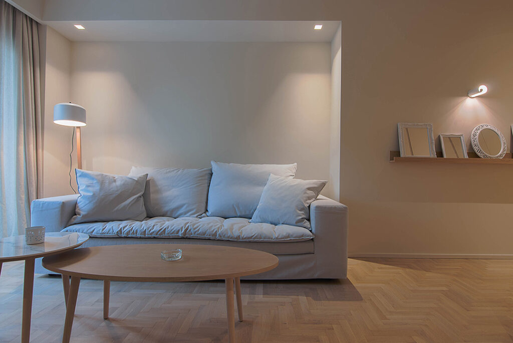 Enjoy peace of mind with bright lights and earthy shades of white and wood.